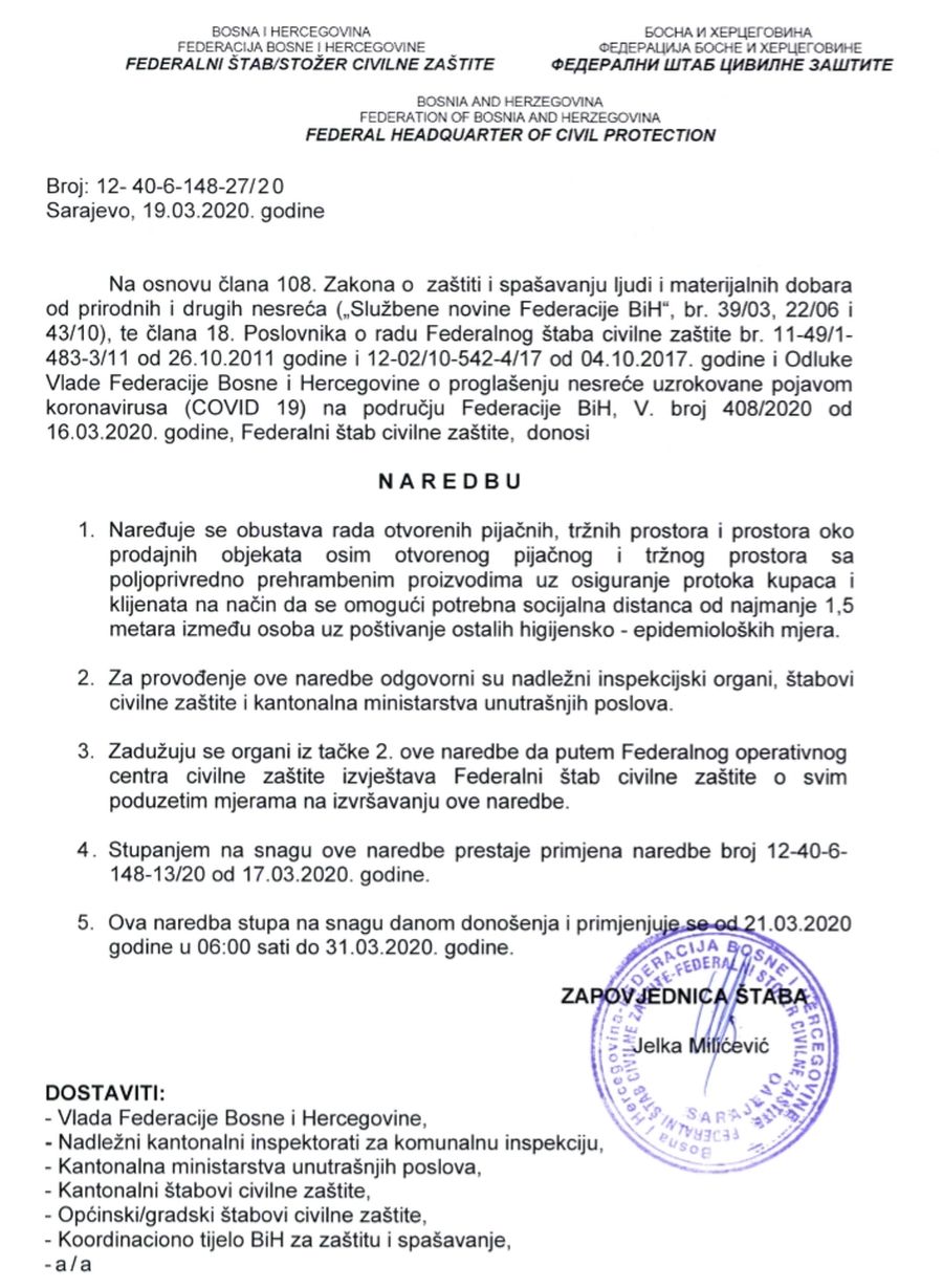 Naređuje se obustava rada otvorenih pijačnih, tržnih prostora i prostora oko prodajnih objekata, osim otvorenog pijačnog i tržnog prostora sa poljoprivredno-prehrambenim proizvodima uz osiguranje protoka kupaca i klijenata na način da se omogući potrebna socijalna distanca od najmanje 1,5 metra između osoba uz poštivanje ostalih higijensko – epidemioloških mjera.