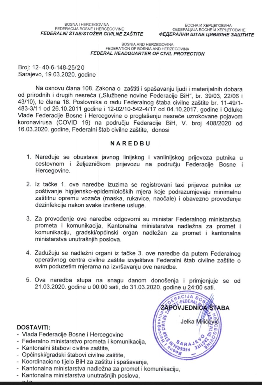 Naređena je i obustava javnog linijskog i vanlinijskog prijevoza lica u cestovnom i željezničkom prijevozu. Iz ove naredbe izuzima se registrovani taxi prijevoz putnika uz poštivanje higijensko-epidemioloških mjera koje podrazumijevaju minimalnu zaštitnu opremu vozača (maska, rukavice, naočale) i obavezno provođenje dezinfekcije nakon svake izvršene usluge. Ova naredba primjenjuje se od 21.3.2020. godine u 00:00 sati.