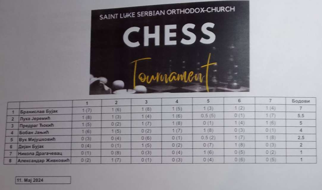 Prvo mjesto na turniru osvojio je Zeničanin Branislav Bujak sa svih sedam pobjeda i 7 poena. Drugo mjesto zauzeo je Luka Jeremić sa 5,5 poena, a treći je bio Predrag Đokić sa 5 poena.