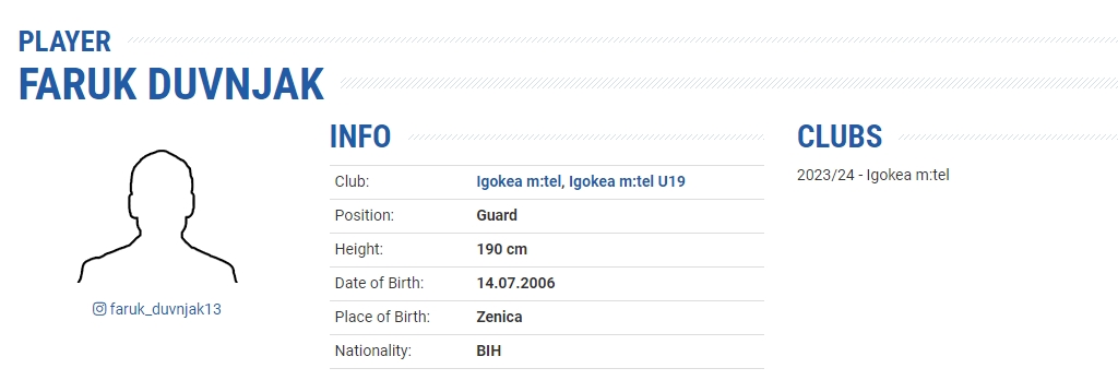 Inače, Faruk Duvnjak je rođen 2006. godine i ponikao je u OKK Abeceda iz Zenice. Nakon dobrih igara u svom rodnom gradu prelazi u KK Igman Burch gdje u dvije zapažene sezone igra odličnu košarku i debituje i u seniorskoj konkurenciji. Ovog ljeta predstavljao je juniorsku reprezentaciju BiH na Evropskom prvenstvu, te postao član aktuelnog juniorskog prvaka BiH ekipe Igokee.