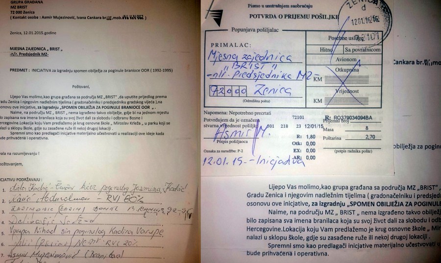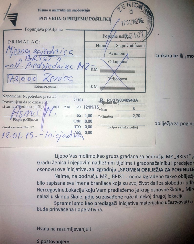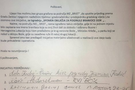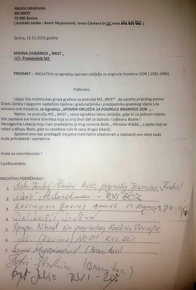 Građanska inicjativa 2015. godine od strane, veterana, članova porodica poginulih sa ovog područja, ratnih vojnih invalida i stanovništva bila je da se izgradi spomen obilježje na platou ispred škole. (inicijativa u prilogu). Također, podnosim inicjativu kao branilac-veteran da naziv škole nosi ime JASMIN KADRIĆ, rođen u Zenici, živio u ovoj MZ, kod škole, pripadnik Patriotske lige Zenica, ogranak Travnička, osoba zadužena za organizaciju otpora na ovom dijelu grada, poginuo 1994.godine kao pripadnik ARBiH. Ove podatke možete provjeriti u Udruženju branilaca “Patriotska liga” Zenica, kontakt broj XXXXXXXXXXX, sekretar Ibrahim. Isto tako, inicjativa za izgradnju spomen obilježja za sve pripadnike poginule u OOR-u 92-95. sa podrucja MZ Brist,Zmajevac,Carina na podrucju platoa ispred skole Miroslav Krleža.