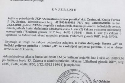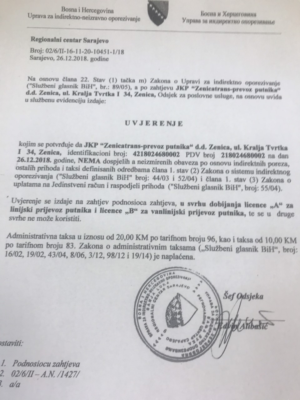 Kako saznaje Zenicablog, prikupljena je sva potrebna dokumentacija, među kojom i najbitnija potvrda iz Porezne uprave FBIH, čije kopije objavljuje naš portal, te bi se sa prvim danima naredne sedmice i godine trebala konačno zaustaviti praksa “skidanja tablica” sa vozila zbog nepoštivanja propisa koji nalaže posjedovanje Licence za odvijanje prijevozničke djelatnosti,a koja je istekla Zenicatransu – prevozu putnika, te nije mogla biti obnovljena zbog poreznog duga koji je sada reprogramiran.
