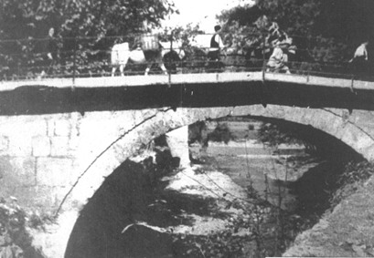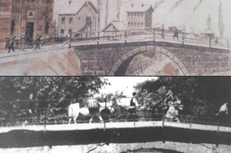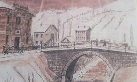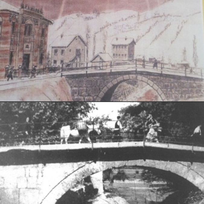 Fotografija kamenitog mosta iz monografije “Željezara Zenica” – Fadil Ademović, 1967. godine. Ilustracija iz “Fotomonografije o starim Zeničanima”, Abdulaha Hodžića, 2014. godine.