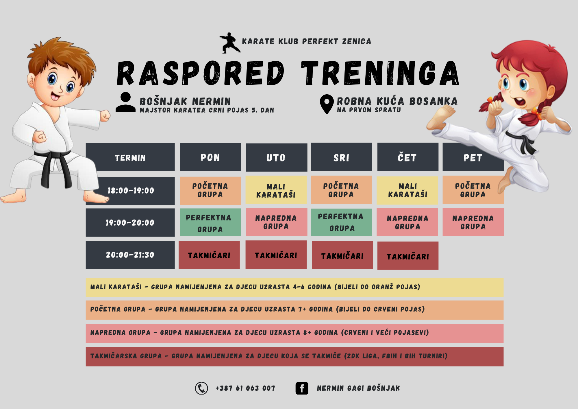 Karate klub *PERFEKT* treninge organizuje u svojoj sali u Robnoj kući *Bosanka* na prvom spratu u pet grupa.