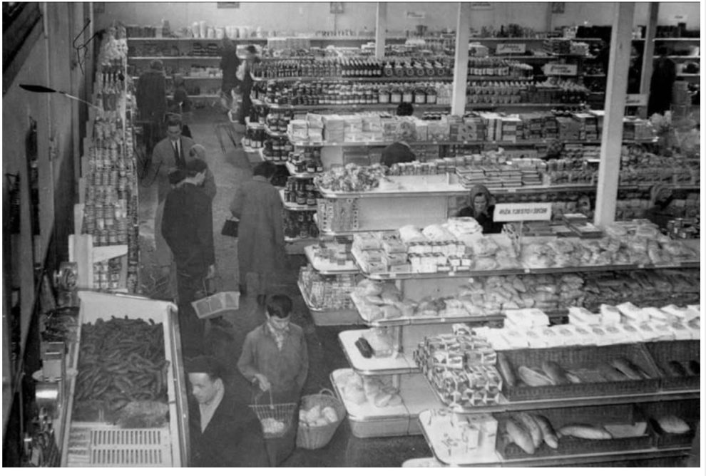 Preko puta Večernje škole u novoizgrađenu halu bila je smještena Velika samoposluga. Moderno opremljena za to doba, sa balkonom unutar na čijem su prednjem zidu bili montirani dvogledi, za nadgledanje, preteča video nadzora, i na koji se balkon povremeno penjao trgovac i posmatrao kroz one dvoglede stanje na terenu.