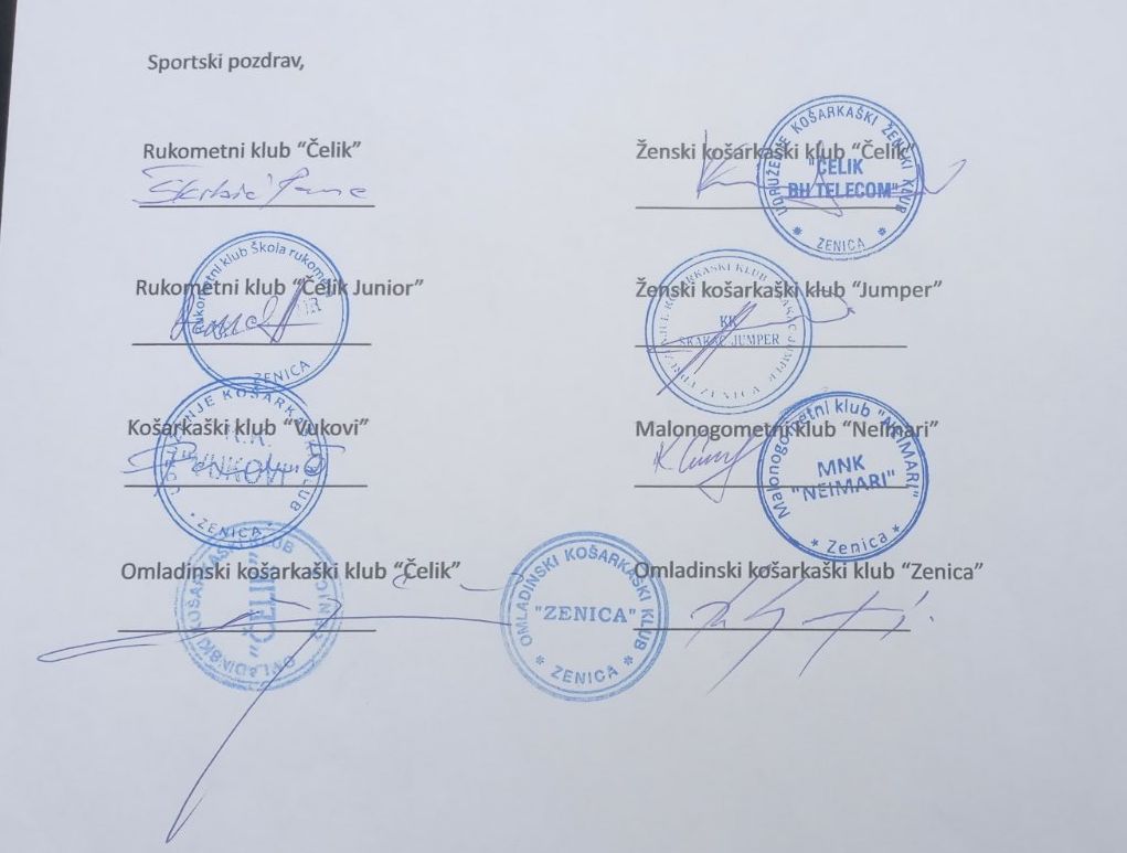 Potpisnici saopćenja su svi dvoranski sportski kolektivi koji imaju seniorski pogon i koji rade na prostoru grada Zenice među kojima su: RK Čelik, ŠR Čelik Junior, OKK Čelik, KŽK Čelik, KK Jumper, KK Vukovi, OKK Zenica i MNK Neimari