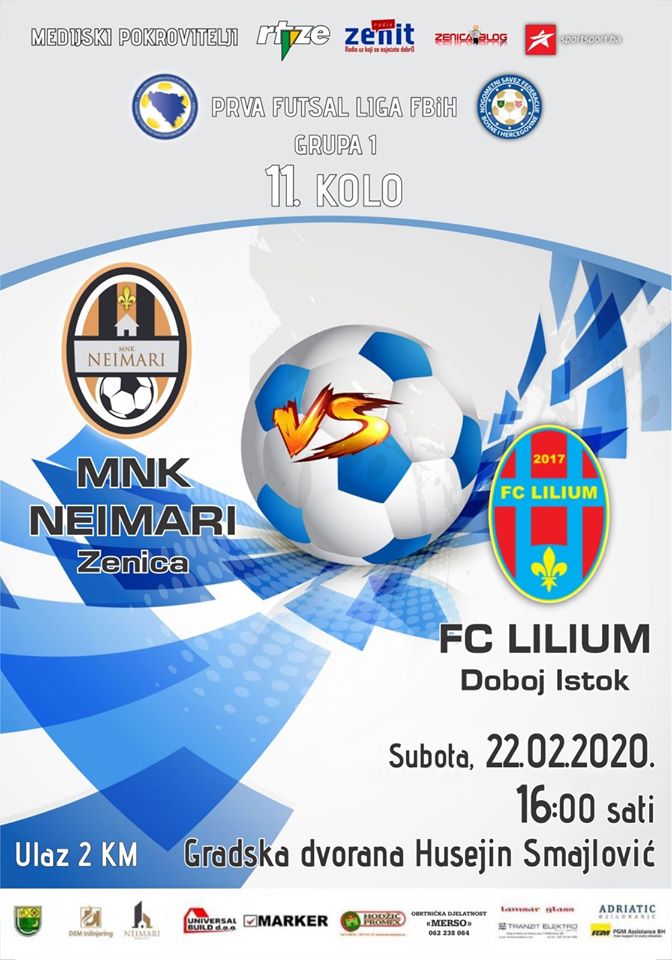 Zenički MNK Neimari i ove subote u 16 sati domaćini u Areni, dolazi ekipa Lilium – Predstojećeg vikenda igraju se utakmice 11.kola Prve futsal lige FBiH, grupa 1, u kojoj nastupa i zenička ekipa MNK Neimari. Uokviru 11.kola Neimari igraju ove subote, 22.2.2020. godine dočekuju ekipu FC Lilium iz Brijesnice Velike (Doboj Istok). Utakmica je na rasporedu u 16 sati na centralnom terenu gradske Arene „Husejin Smajlović“ u Zenici.