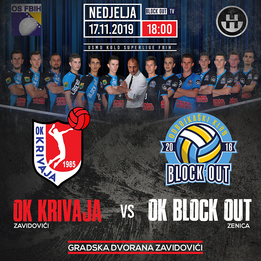 Utakmica OK ” KRIVAJA ” Zavidovići – OK “BLOCK OUT” Zenica igra se u nedjelju, 17.11.2019. u Gradskoj dvorani Zavidovići sa početkom u 18:00 sati.