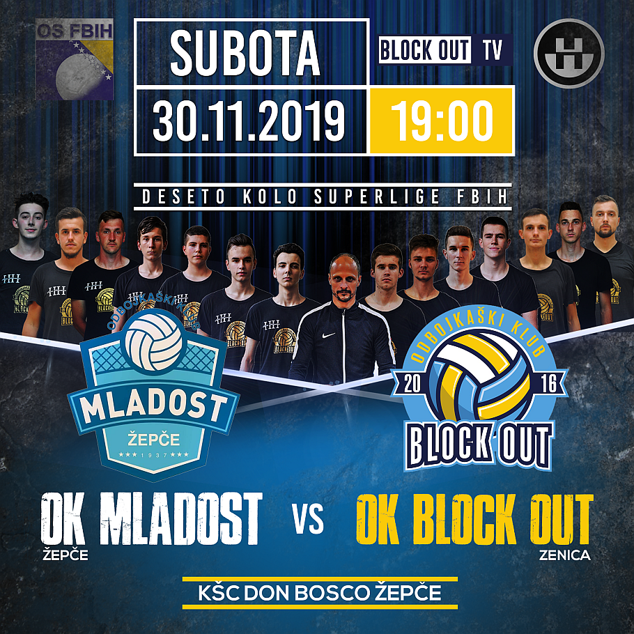 Utakmica OK ”MLADOST” Žepče – OK “BLOCK OUT” Zenica igra se u subotu, 30.11.2019. u KŠC Don Bosco Žepče sa početkom u 19:00 sati.