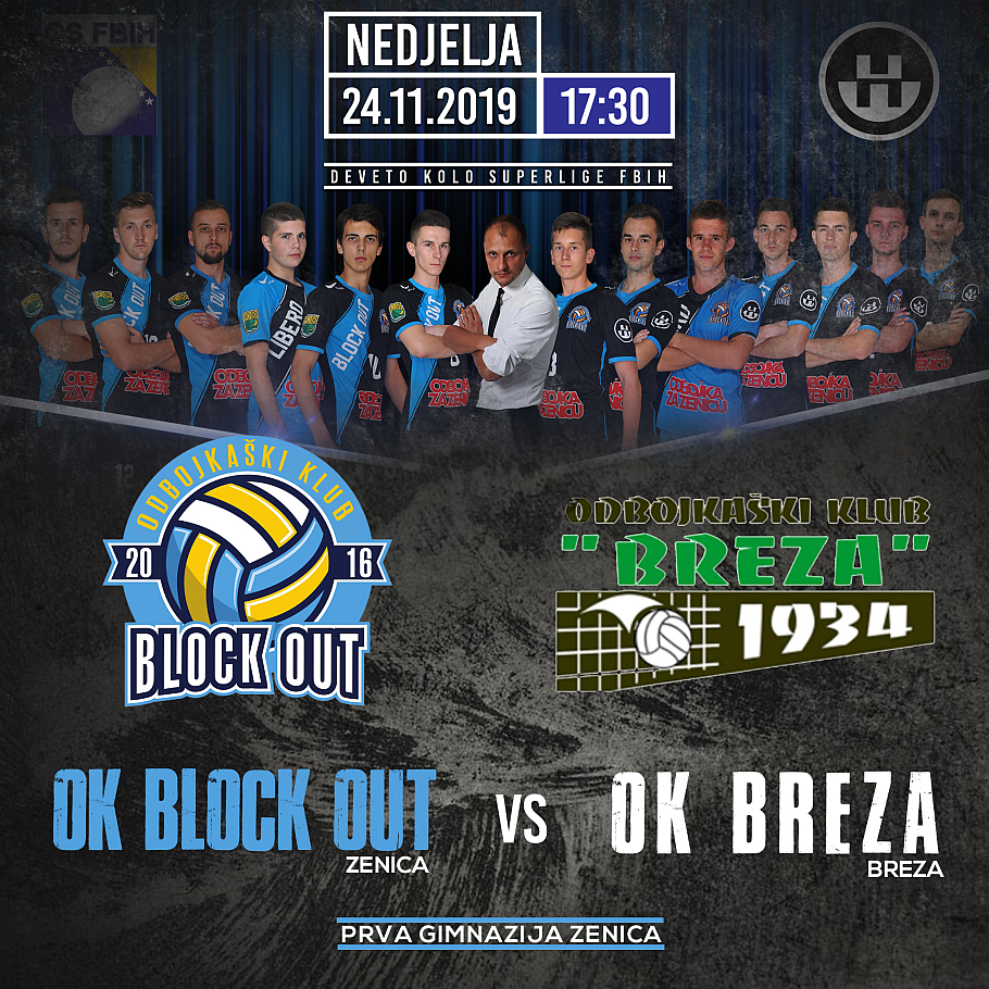 Utakmica OK “BLOCK OUT” Zenica – OK “BREZA 1934” Breza igra se u nedjelju, 24.11.2019. u Prvoj Gimnaziji Zenica sa početkom u 17:30 sati.