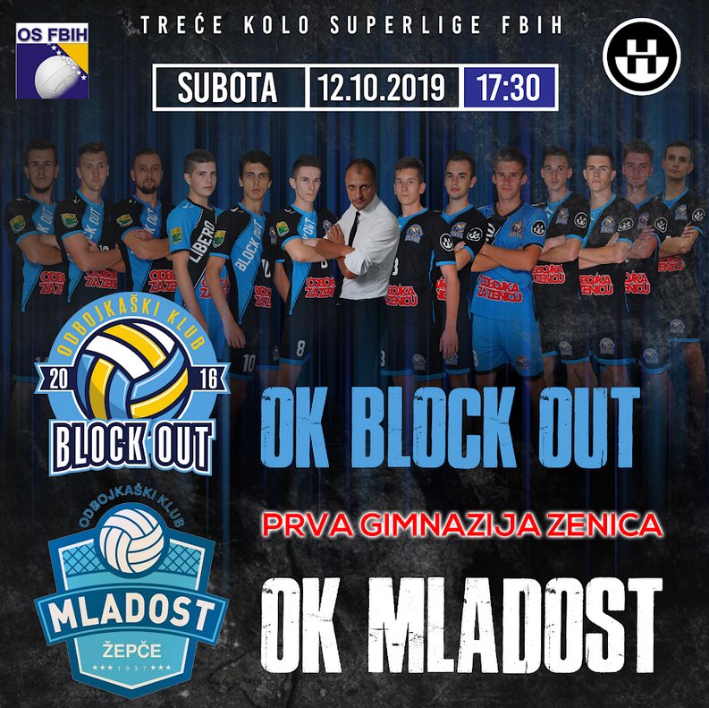 Utakmica OK “BLOCK OUT” Zenica – OK “MLADOST” Žepče igra se u subotu, 12.10.2019. u Prvoj Gimnaziji Zenica sa početkom u 17:30 sati.