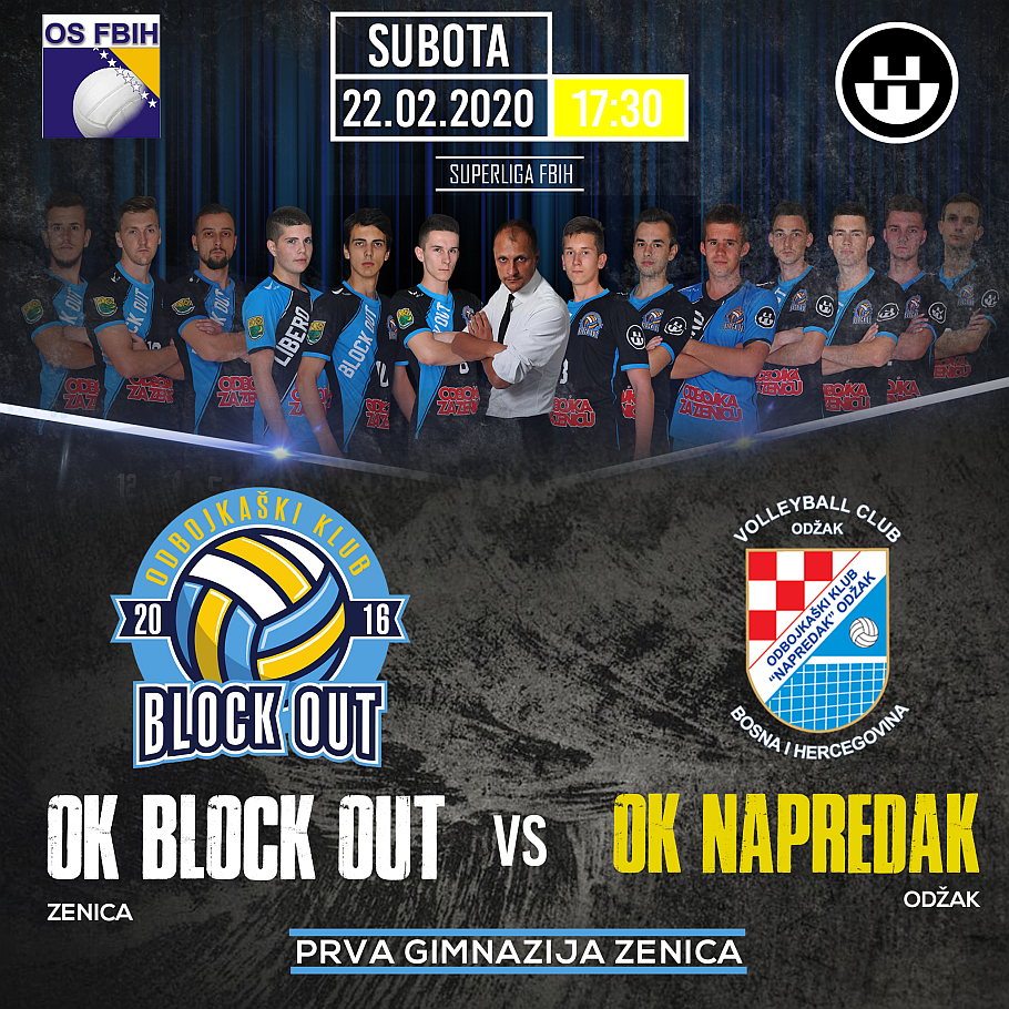 Utakmica OK “BLOCK OUT” Zenica – OK “NAPREDAK” Odžak igra se u subotu, 22.02.2020. u Prvoj Gimnaziji Zenica sa početkom u 17:30 sati.