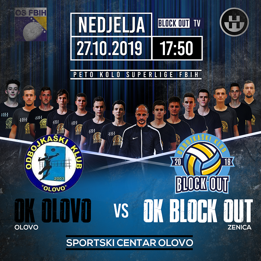 Utakmica OK “OLOVO” Olovo – OK “BLOCK OUT” Zenica igra se u nedjelju, 27.10.2019. u Sportskom centru Olovo sa početkom u 17:50