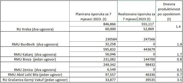 Jedan uposlenik Rudnika mrkog uglja Zenica u prosjeku dnevno iskopa 500 kilograma uglja. Poređenja radi, jedan uposlenik Rudnika uglja Gornji Vakuf dnevno iskopa 3,5 tona uglja. Zvanično, rudari zeničkog rudnika su najneučinkovitiji u cijelom koncernu. Zvanično, RMU Zenica je u svom plan u naveo da će iskopati 330 hiljada tona. Prema ugovorima, taj Rudnik je trebao za prvih sedam mjeseci ove godine isporučiti Elektroprivredi BiH 249 hiljada tona. Isporučili su samo 98 hiljada tona. I u ovom je segmentu zenički rudnik najgori u Federaciji BiH.