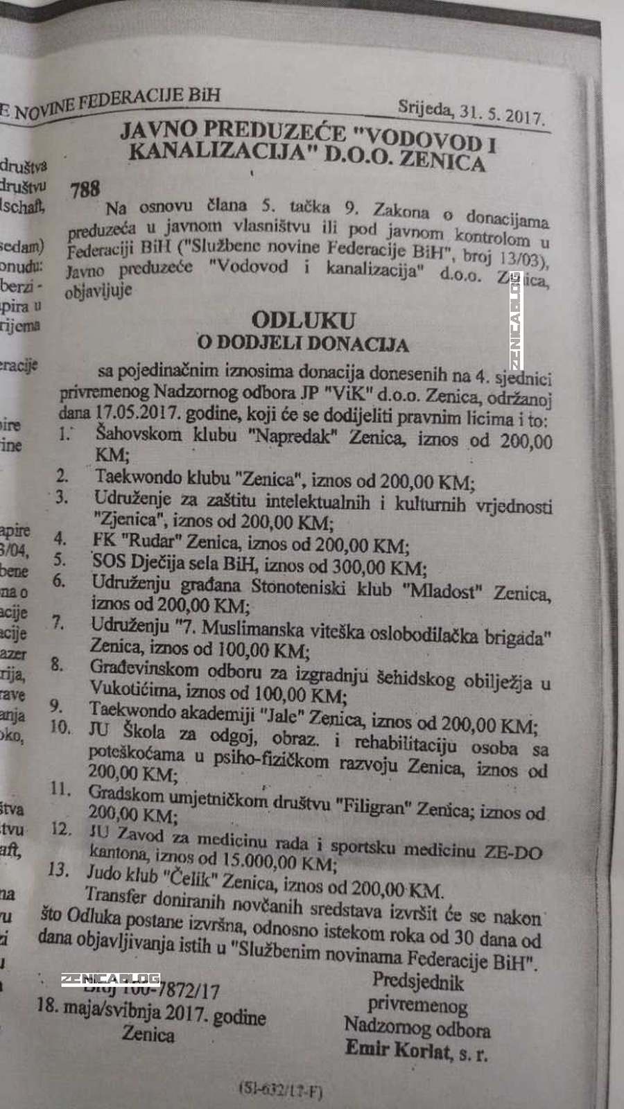Zenički ViK štedi vodu, ali rasipa novac: donirano 15.000 KM Zavodu kojeg vodi gradonačelnikova supruga – Prošlogodišnja jesen bila je u znaku odluke tadašnjeg Nadzornog odbora Javnog preduzeća Vodovod i kanalizacija Zenica, koji je, prema aktima preduzeća i uprave, tadašnjem direktoru Ekremu Kahrimanu dodjelio nagradu za uspješan rad u značajnom novčanom iznosu, koji nikada nije javno saopćen.