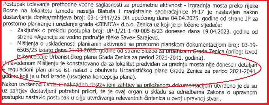 Da postoji sumnja u legalnost mnogo toga izgrađenog u posljednje vrijeme u Zenici kazuje i da je ova Agencija prvotno odbila zahtjev za prethodnu vodnu saglasnost za izgradnju mosta preko Bosne u naselju Blatuša jer ne postoji važeći Urbanistički plan Grada.