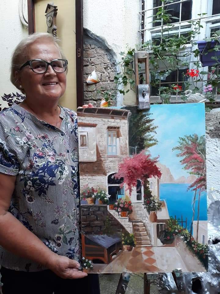 Jedna od polaznica tzv. „Škole slikanja“, 72-godišnja Zeničanka Sabiha Bajramović, svoju prvu sliku je naslikala upravo u toj bašti, na kursu slikanja koji je upisala prije tačno dvije godine. Kao i većina polaznica kursa, i Sabiha je početnica, koja se kistom i bojama počela razonoditi u poznim godinama života.