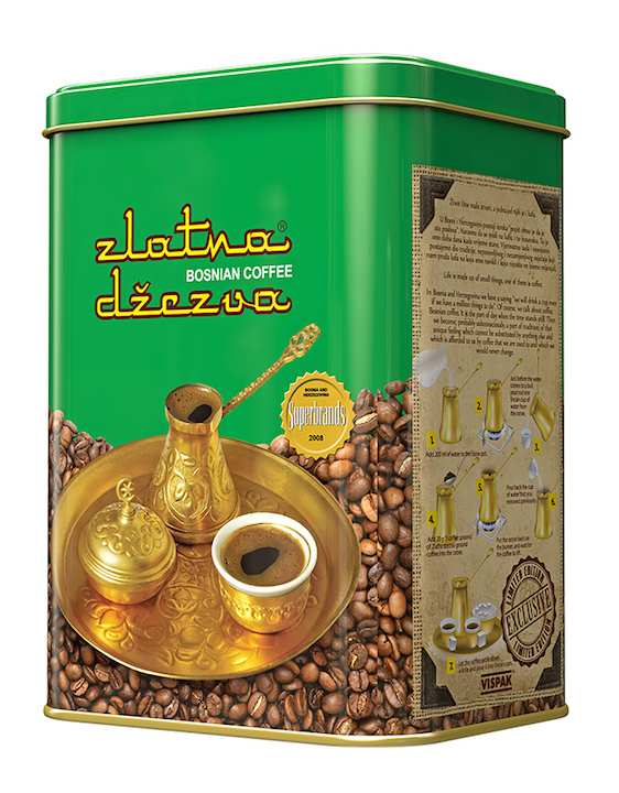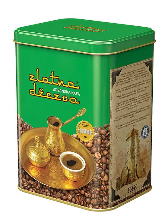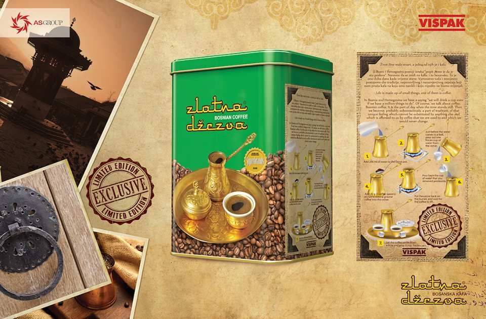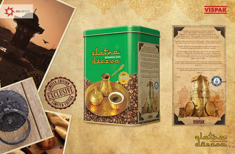 Zlatna džezva bosanska kafa – Bosanskohercegovačka prehrambena industrija Vispak d.d. Visoko povodom 44 godine uspješnog rada ove kompanije i postojanja branda Zlatna džezva plasirala je na tržište novu brandiranu limenku “Zlatna džezva bosanska kafa” kao Limted edition (ograničena serija) u znak zahvalnosti svim vjernim ljubiteljima prave bosasnke kafe.