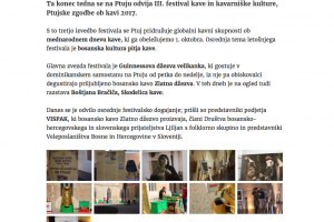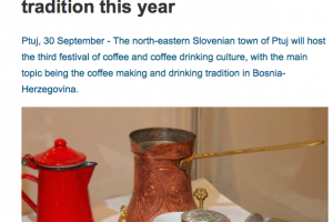 Zlatna džezva privukla veliku pažnju slovenskih medija:“Ćejf je univerzalna kategorija” – Zlatna džezva i Vispakova Guinnessova najveća džezva na svijetu privukle su veliku pažnju slovenskih medija, nastupivši najprije u Ptuju na Festivalu “Ptujske zgodbe ob kavi”, a potom i na “Danu kave” u Ljubljani. Tema Festivala bila je “bosanska kultura ispijanja kafe”, a Zlatnu džezvu mediji su proglasili glavnom zvijezdom.