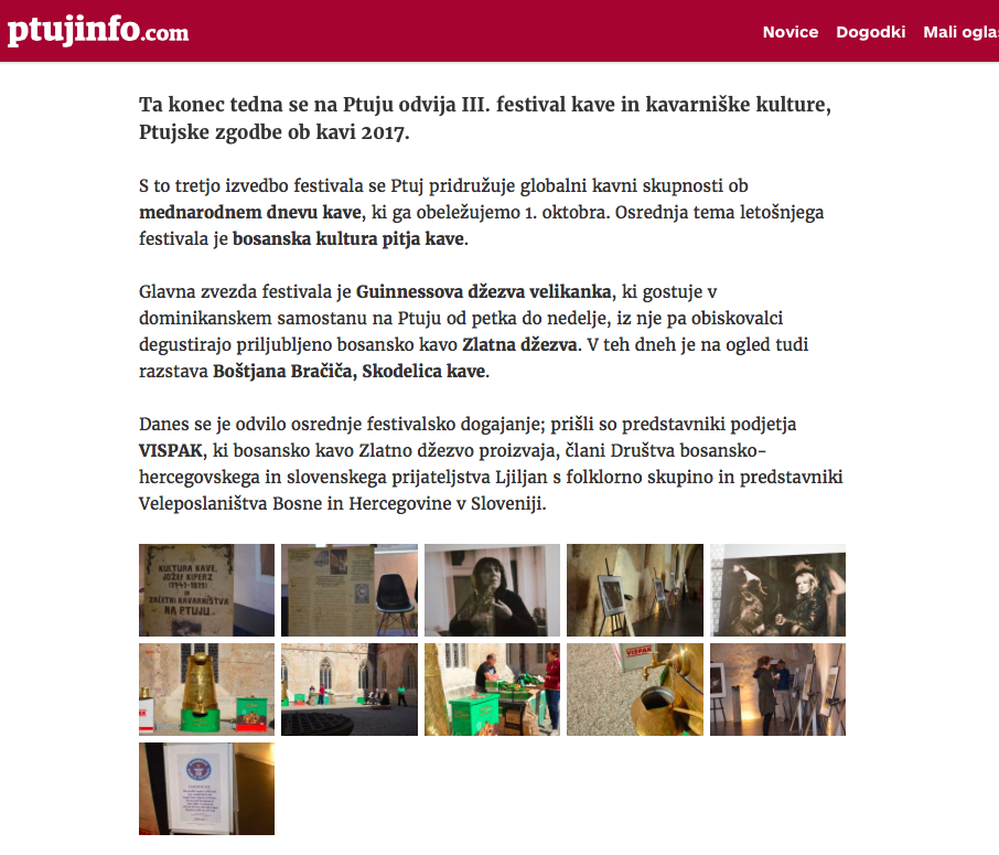 Zlatna džezva privukla veliku pažnju slovenskih medija:“Ćejf je univerzalna kategorija” – Zlatna džezva i Vispakova Guinnessova najveća džezva na svijetu privukle su veliku pažnju slovenskih medija, nastupivši najprije u Ptuju na Festivalu “Ptujske zgodbe ob kavi”, a potom i na “Danu kave” u Ljubljani. Tema Festivala bila je “bosanska kultura ispijanja kafe”, a Zlatnu džezvu mediji su proglasili glavnom zvijezdom.
