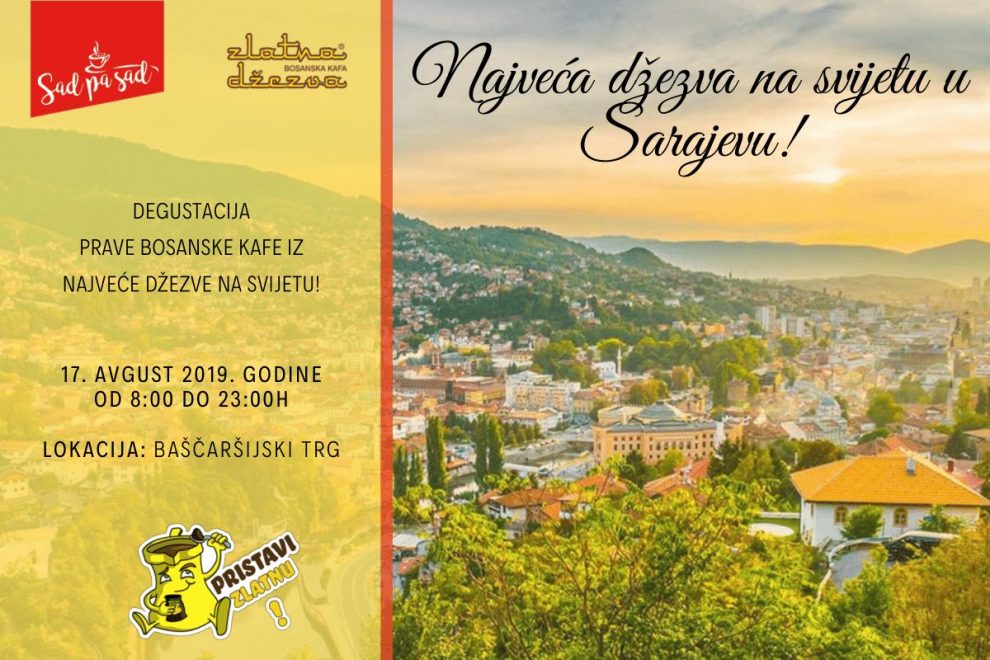 Zlatno sarajevsko jutro uz pravu bosansku kafu – Drugog dana Sarajevo Film Festivala, u subotu 17. augusta gosti, posjetioci i građani, imat će priliku probati pravu bosansku kafu iz najveće džezve na svijetu. Vispakova Guinnessova džezva bit će postavljena na Baščaršiji (kod Sebilja) od 8 sati ujutro.