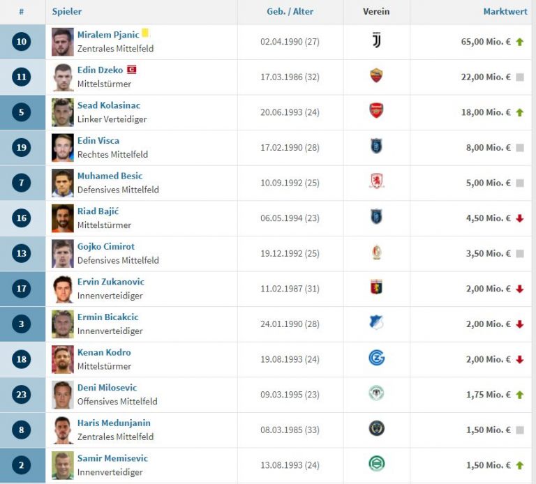 Vrijednost kapitena reprezentacije Edina Džeke procijenjena je na 22 miliona eura, a dalje slijede Sead Kolašinac koji vrijedi 18 miliona te Edin Višća sa vrijednošću od osam miliona eura. Slijede Muhamed Bešić, zatim Riad Bajić,…