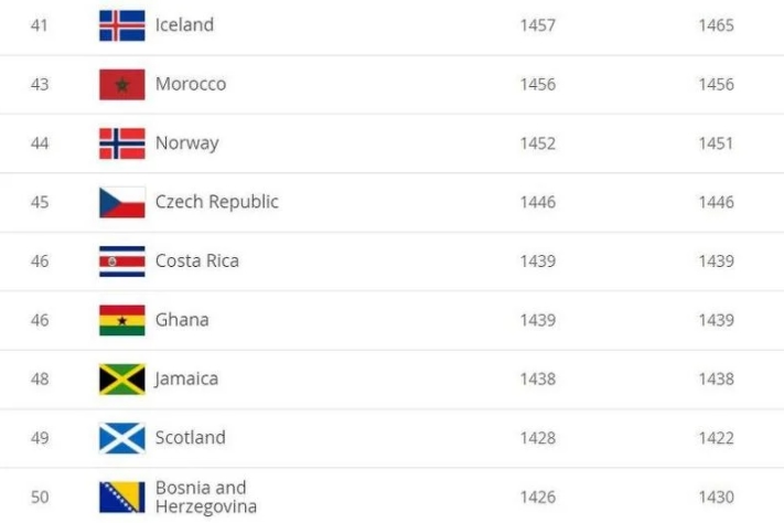 Zmajevi su nazadovali za jedno mjesto i sada se nalaze na 50. poziciji sa 1.426 bodova, četiri manje u odnosu na prošlu listu koja je napravljena u julu.