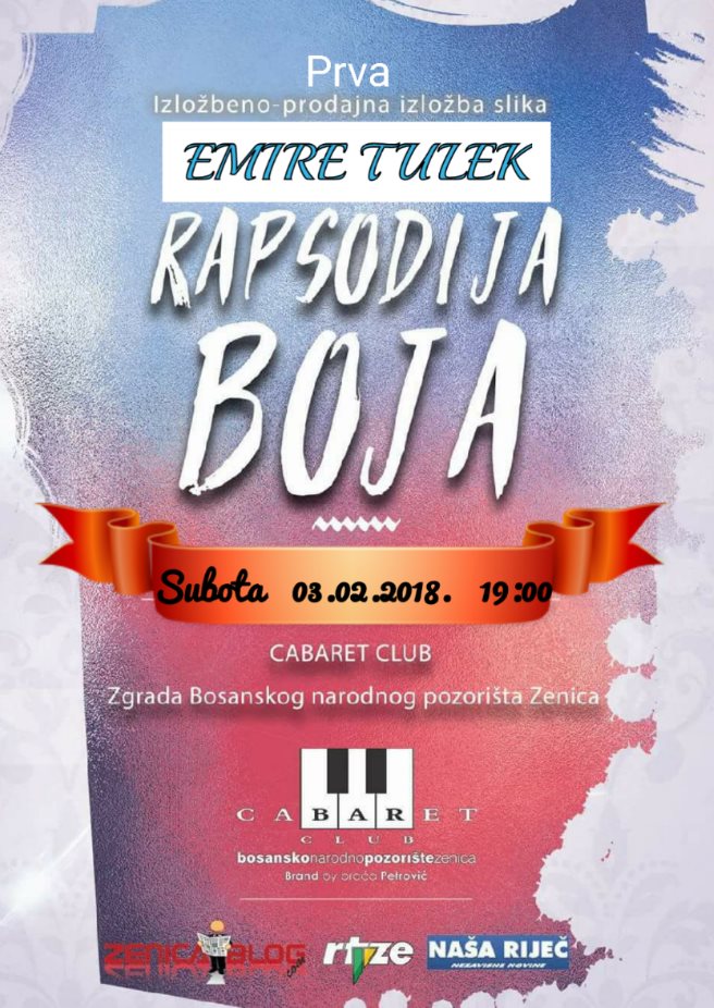 Braća Petrović, Ivan i Andrija, nastavljaju sa kulturno-umjetničkim sadržajima u Cabaret clubu, koji se nalazi u zgradi Bosanskog narodnog pozorišta Zenica. Ovaj put u goste im dolazi umjetnica iz Bihaća, Emira Tulek, da se sa svojom prvom samostalnom izložbom “RAPSODIJA BOJA” predstavi Zeničkoj javnosti. Izložba će biti u okviru programa “GALERIJA”, gdje braća Petrović konstantno rade izložbe, sa slikarima iz cijele BiH ali i regiona, a cilj im je ukazati na prijeko potrebnu gradsku galeriju. Izložba je u subotu, 03.02.2018. sa početkom od 19:00.