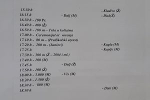 Miting će početi u 15,30 sati disciplinom kladivo za žene. Ceremonija svečanog otvaranja manifestacije je u 17 sati. Nakon toga u 17,25 na programu je bacanje kugle, dok je u 18,30 sati trka na 800 metara.