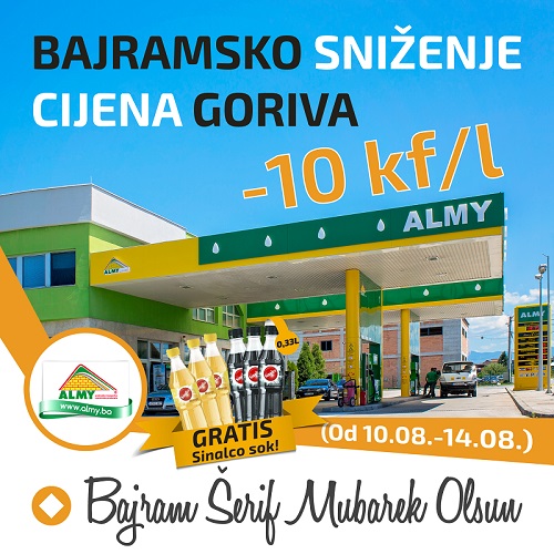 ALMY benzinske pumpe – Tradicionalno sniženje cijena goriva i LPG plina za -10kf/L za vrijeme Kurban bajrama i ove godine samo na benzinskim pumpama Almy u Zenici, Sarajevu i Zavidovićima.