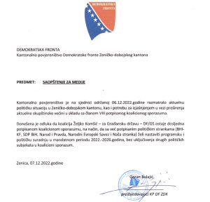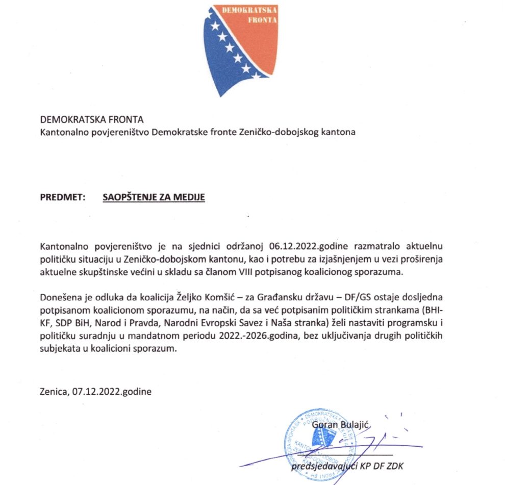 Donesena je odluka da koalicija Zeliko Komšić – za Građansku državu- DF/GS ostaje dosljedna potpisanom koalicionom sporazumu, na način, da sa već potpisanim političkim strankama (BHI- KF, SDP BiH, Narod i Pravda, Narodni Evropski Savez i Naša stranka) želi nastaviti programsku i političku suradnju u mandatnom periodu 2022.-2026.godina, bez uključivanja drugih političkih subjekata u koalicioni sporazum.