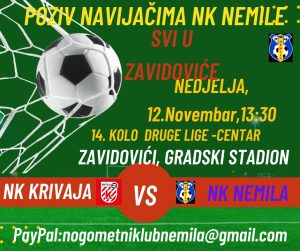 Novi drugoligaš NK Nemila iz istoimenog mjesta, trenera Aidina Mahmutovića, u 14. kolu gostuje ekipi NK Krivaja iz Zavidovića, koja se nalazi na 5. mjestu sa 24 boda (7 pobjeda, 3 remija i 3 poraza).