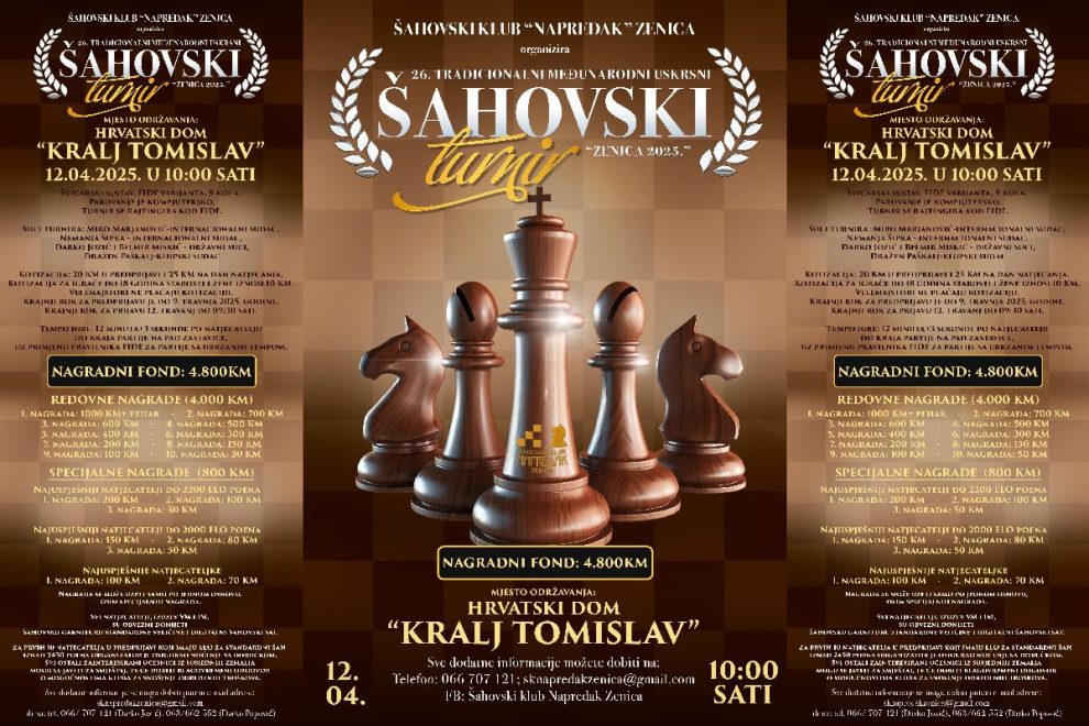 Šahovski klub „Napredak“ Zenica je organizator 26. tradicionalnog međunarodnog uskrsnog šahovskog turnira Zenica 2025. godine. Turnir će biti jednodnevni po ubrzanom tempu.