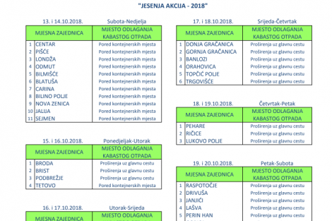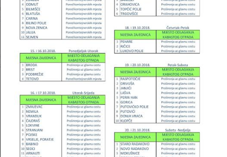Obavještavaju se građani iz navedenih mjesnih zajednica  da svoj kabasti otpad (stari namještaj, otpad bijele tehnike, dotrajale aparate iz domaćinstva, elektronske i druge kabaste predmete) odlože pored proširenja uz glavnu cestu u zakazane dane odvoza.