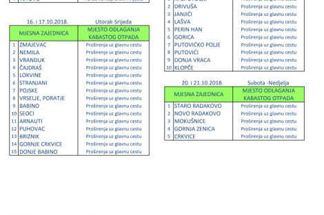 U srijedu, 17. i četvrtak, 18.10.2018. godine, odvozit će se prikupljeni kabasti otpad iz slijedećih mjesnih zajednica: