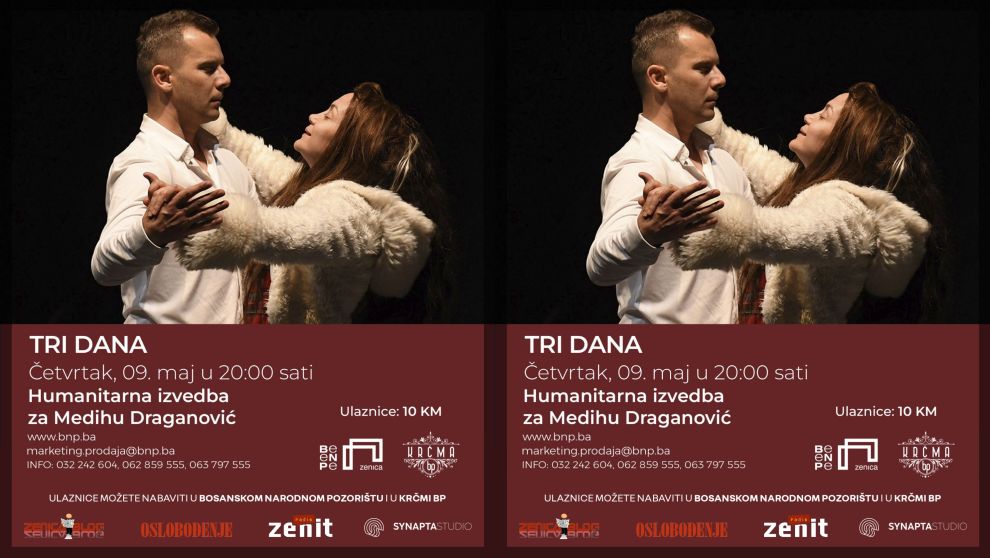 S namjerom da pomogne u prikupljanju sredstava za troškove liječenja naše sugrađanke Medihe Draganović, koja duže vrijeme boluje od nesitnoćelijskog raka pluća, Bosansko narodno pozorište Zenica priredit će predstavu “Tri dana” (Pad i uspon gospodina B.) 9. maja ove godine sa početkom u 20,00 sati.