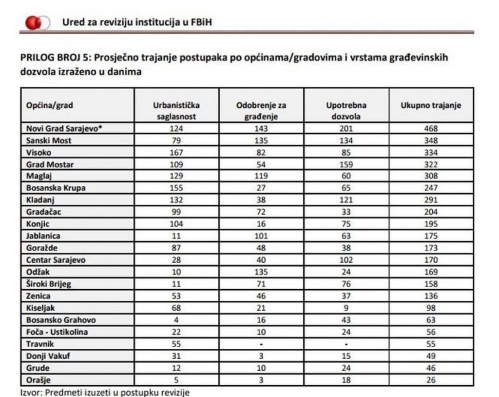 Također, revizori su u izvještaju zaključili i kako je u pojedinim slučajevima efikasnije i lakše dobiti legalizaciju bespravno izgrađenog objekta, nego građevinsku dozvolu u redovitoj proceduri. Tako u pojedinim općinama objekt možete legalizirati za devet dana, a urbanističku saglasnost za 158 dana, što je nepojmljivo.