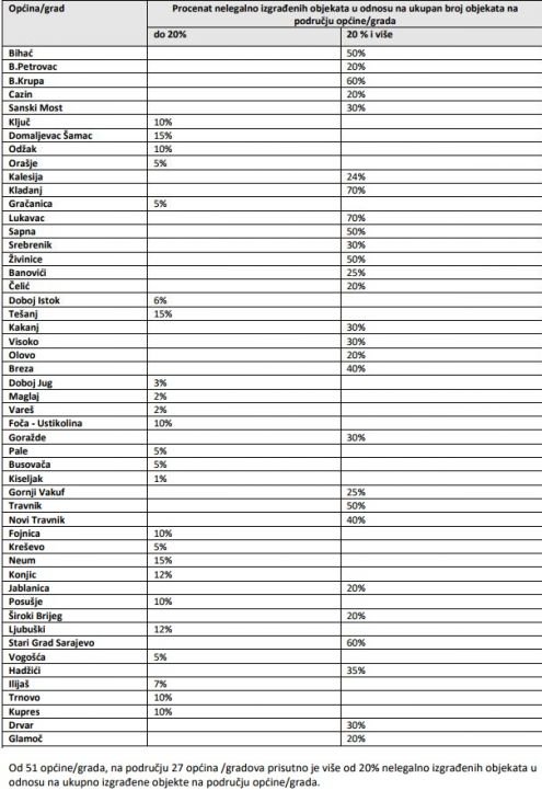 To sve u konačnici dovodi do nevjerovatnih podataka da pojedine općine imaju rekordne stope nelegalne gradnje, pa je tako u Kladnju i Lukavcu zabilježeno 70 posto nelegalno izgrađenih objekata u odnosu na ukupan broj izgrađenih objekata, a prednjače i općine Bosanska Krupa i Stari Grad Sarajevo sa po 60 posto nelegalno izgrađenih objekata.